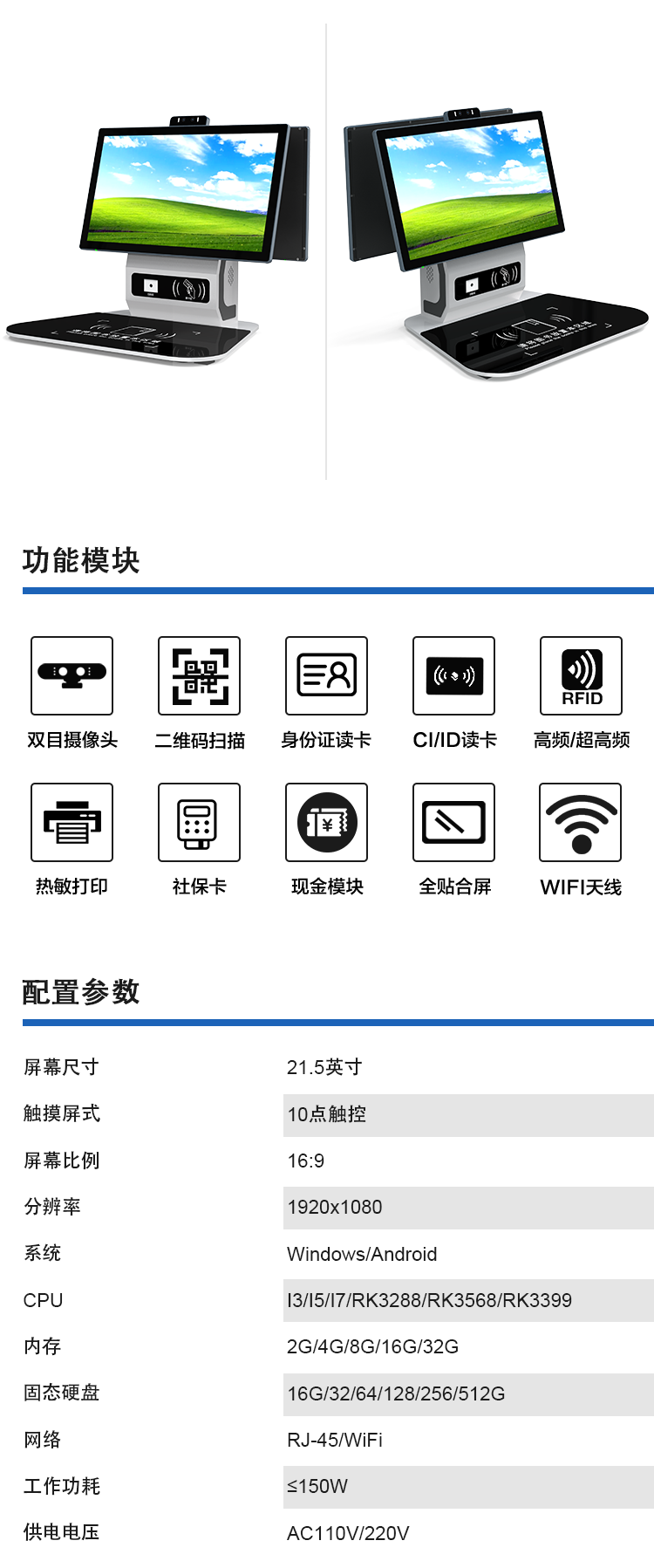 高清大屏: 21.5寸触摸屏,显示清晰,操作便捷。