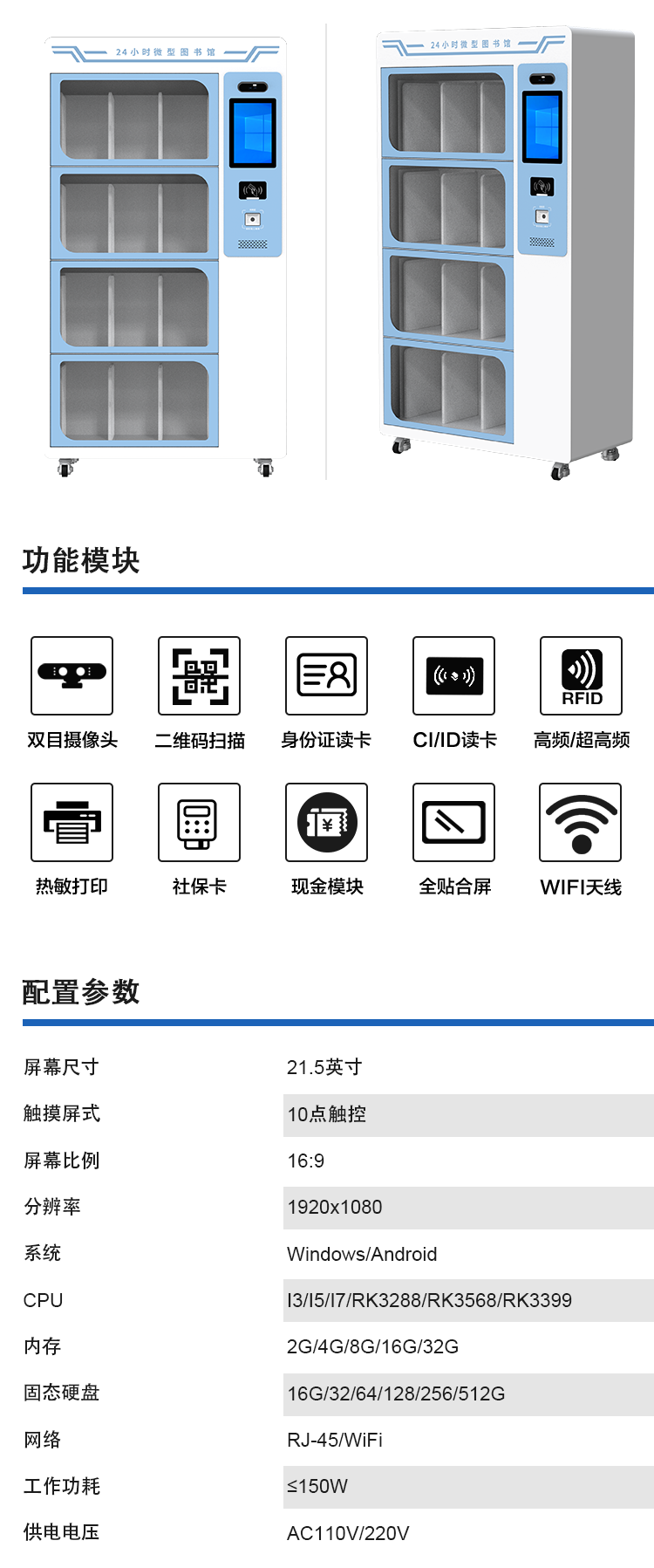 多功能一体机: 支持自助借还、人脸识别、图书感应、刷卡扫描、等功能,满足读者多种需求。